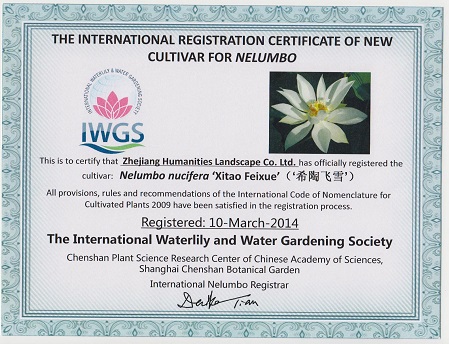 3月10日,我园自主培育的荷花新品种——“希陶飞雪”获得国际莲属新品种登录证书。“希陶飞雪”群体花期长,可延期至11月上中旬,花姿飞舞状,着花密度大,以纪念我国著名植物学家蔡希陶先生(1911~1981年)。3月20日,国际荷花品种登录权威田代科博士向我园颁发登录证书,这次的登录成功,充分展示了我园在荷花新品种培育方面的技术力量,也给予了我园研究人员极大的鼓励和支持,研究人员表示将不骄不躁,继续努力为我园的水生植物品种收集、新品种培育和应用事业做出更大的贡献。 (沈燕)